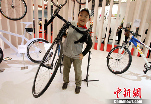 4月5日,2012上海臺灣名品博覽會在上海世博展覽館開幕,其中“臺灣精品館”10項(xiàng)創(chuàng)新產(chǎn)品擁有全球第一殊榮,成為各界矚目焦點(diǎn)。圖為用碳纖維制作的全世界最輕的自行車,僅六點(diǎn)七公斤,兒童也能輕易提起。 123,123