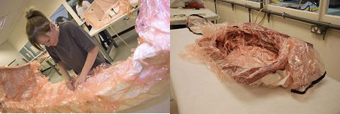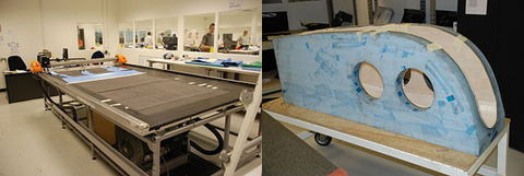 這樣即可為揚聲器的外形制成固化的外殼。然后將芯料(這里是巴沙木)裝入外殼的內(nèi)表面中,再重復整個裝袋和固化過程。 然后再在巴沙木芯表面添加碳纖維外殼,形成夾心結(jié)構(gòu)。