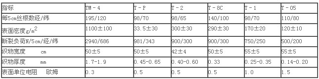 石墨碳纖維可以織成斜紋、平紋、緞紋等不同組織的織物,光明山“化纖”生產(chǎn)“烏拉爾”系列石墨碳纖維織物,品種有TM–4、T–P等6個(gè),灰分含量0.5%,回潮率不大于1.0%,技術(shù)指標(biāo)見(jiàn)表1。
