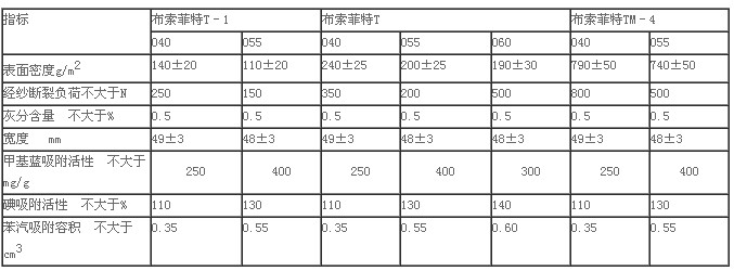粘膠活性碳纖維有很強(qiáng)的吸附性,遠(yuǎn)遠(yuǎn)勝過(guò)活性碳。光明山“化纖”的活性碳纖維技術(shù)指標(biāo)如下:?jiǎn)卫w直徑6–10微米,比表面積700–2000 m2/g,吸附孔容積0.3–0.9cm3/g,單位電阻0.02–2歐姆.cm。用粘膠技術(shù)絲碳化–活化之后制成碳纖維吸附過(guò)濾材料,名叫“布索菲特”,分為條子,織物,非織造物,其中織物有3種,厚度0.2–1.5mm。技術(shù)指標(biāo)見(jiàn)表2??梢詫⒉妓鞣铺豑–1和T各兩層,組成TM–4,即四層材料。布索菲特吸附過(guò)濾材料用于吸附廢水、污水中的有機(jī)有毒物質(zhì),用于封閉系統(tǒng)內(nèi)的空氣凈化,個(gè)人防毒吸附裝置等。
