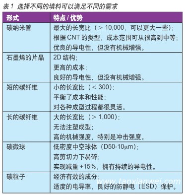 碳的加入可以是多種形式:作為碳納米管(CNT)、石墨烯的片晶、短或長的碳纖維、碳微球和簡單的碳粒子。表1總結(jié)了這些形式各自的優(yōu)勢。這些填充材料使塑料可以導(dǎo)電,以提供EMI屏蔽。大部分CNT填充塑料的電阻率能小于10嗎?以厘米計(jì),在1%至5%的填料體積和1以下?以厘米計(jì),填料體積在5%至10%。有時(shí)候,可以通過碳系填料金屬涂層來增加導(dǎo)電性。