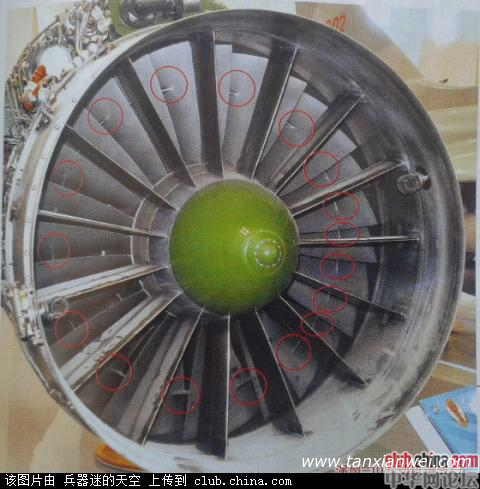 因此,有些風扇就在每個葉片的兩側加一個凸臺,專業(yè)術語稱為“凸肩”。建國60周年空軍成就展上披露,在殲11系列的AL31FN和WS-10A發(fā)動機進氣口,都有這樣的凸肩(見下圖)。這樣,葉片全部高速旋轉時,各凸肩形連起來成了一個加強環(huán),增加了葉片剛度。而且,葉片是依次疊加的,每個凸肩“頂”著前面一個葉片,有效降低了阻尼震顫。但這樣做的后果,是凸肩增加了葉片厚度和重量,同時增加了葉片數量,降低了發(fā)動機的推重比。