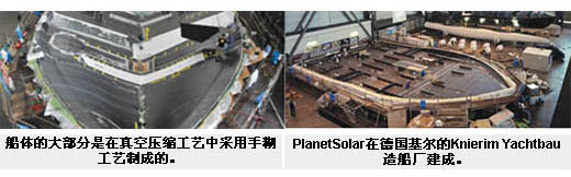 該船所使用的碳纖維材料由總部位于德國Wiesbaden的SGL集團提供。在TuANOR PlanetSolar號的建造過程中,Knierim公司使用了三種不同的碳纖維形式:單向織物、300-400 g/m2的雙軸向織物和相同密度的碳纖維編織物。