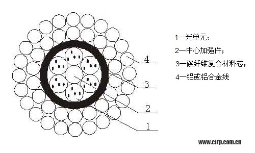 光纖復合架空地線(OPGW)是架空導線和光纖的復合體,具有傳輸電能和通信的雙重功能。隨著碳纖維復合材料在架空導線的應用,光纖復合架空地線中使用碳纖維復合材料也將是指日可待的事情。由于碳纖維復合材料取代了鍍鋅鋼線或鋁包鋼線,這種新型的光纖復合架空地線也具有重量輕、強度高、低弛度、耐腐蝕、低線損的特點。碳纖維復合材料的優(yōu)勢突出體現(xiàn)它在大截面、大芯數(shù)的OPGW中的應用。下面是這種使用新材料的OPGW的結構圖。