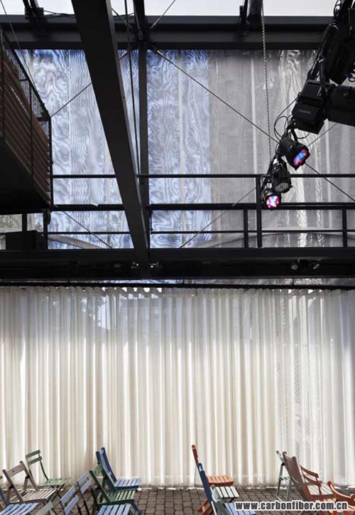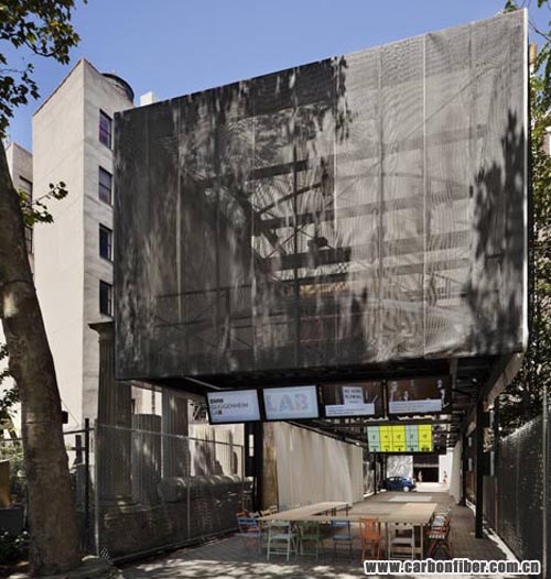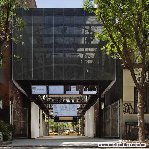 The lower half of the BMW Guggenheim Lab structure is an open space that can be configured to meet the particular needs of the various programs, shifting from a formal lecture setting with a stage to the scene for a celebratory gathering or a workshop. The upper, “toolbox” portion of the structure is loosely wrapped in two layers of semitransparent mesh, which creates a shimmering moiré effect and allows visitors to catch glimpses of the extensive apparatus of “tools” that can be raised or lowered on a rigging system to configure the lower space for the different programs. Remarkably, the BMW Guggenheim Lab is the first building designed with a structural framework composed of carbon fiber. Videos and images of the structure and the construction process can be viewed at youtube.com/bmwguggenheimlab and flickr.com/bmwguggenheimlab. copyright 123456