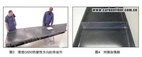 熱塑性復(fù)合材料主結(jié)構(gòu)件是一個過去即有涉獵的領(lǐng)域。灣流G550和G650 飛機的壓力艙壁板(圖2)是一系列帶壓力成型加強肋的碳/聚醚酰亞胺??湛虯400M 的駕駛艙地板就是用熱塑性復(fù)合材料制造的。最近,已經(jīng)著手焊接主操縱面。新型灣流G650 公務(wù)機(JEC2010 創(chuàng)新獎得主)的方向舵和升降舵就是感應(yīng)焊接的多肋扭力盒結(jié)構(gòu)(圖3)。