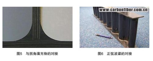 2003 年,一種碳/ 聚醚醚酮單向帶(Cytec)制成的客機地板梁得到發(fā)展。這種可高效制造產(chǎn)品很適合航空業(yè),因此,緯線鋪放(pick & place)被選作腹板和緣條的預(yù)成型體成型方法。所有這些元件都在共固結(jié)的過程中被熔合在一起。在研發(fā)工字梁組合件的過程中,曾經(jīng)尋求一種可簡化制造大量加強肋的方法。該方法是“對接”1 塊平層壓板,將其與普通工字梁共固結(jié)在一起(圖4)。這被證明是一個有效的解決方案。在制造上比最初設(shè)計的壓力成型加強肋的方法簡單得多。對接強度采用注射成型,增加了坡口圓角半徑,得到了優(yōu)化(圖5)。