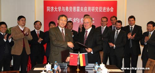 雙方簽署了《同濟(jì)大學(xué)和弗勞恩霍夫應(yīng)用研究促進(jìn)協(xié)會(huì)戰(zhàn)略合作協(xié)議》,并共同為合作成立的“同濟(jì)大學(xué)——弗勞恩霍夫?qū)W院”揭牌。此外,同濟(jì)大學(xué)校長(zhǎng)助理、汽車(chē)學(xué)院院長(zhǎng)余卓平教授和弗勞恩霍夫制造技術(shù)和應(yīng)用材料研究所(IFAM)Busse教授,校長(zhǎng)助理、材料學(xué)院院長(zhǎng)吳廣明教授和弗勞恩霍夫建筑物理研究所(IBP)Hauser教授在雙方戰(zhàn)略協(xié)議框架下,又簽署有關(guān)電動(dòng)汽車(chē)和建筑材料測(cè)試領(lǐng)域的兩個(gè)合作備忘錄。根據(jù)合作備忘錄,“同濟(jì)大學(xué)——弗勞恩霍夫?qū)W院”的首個(gè)項(xiàng)目將在電動(dòng)汽車(chē)領(lǐng)域啟動(dòng),與材料領(lǐng)域相關(guān)的備忘錄則涉及共同建立一個(gè)建筑材料野外試驗(yàn)基地。