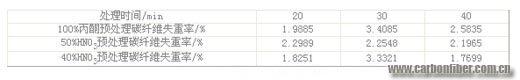 采用經(jīng)過100%丙酮、50% HNO3、40%HNO3浸泡120分鐘的碳纖維,在過磷酸銨配制的溶液中進(jìn)行處理。處理后碳纖維的失重率見表4。