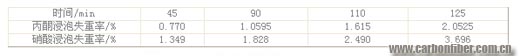 采用丙酮、硝酸作為溶劑進(jìn)行浸泡,不同濃度條件下,碳纖維浸泡后的失重率見表2。