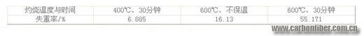 采用在空氣中進(jìn)行灼燒的方法,分別在400℃保溫30分鐘,升溫至600℃不保溫和升溫至600℃保溫30分鐘。碳纖維失重率見表4。