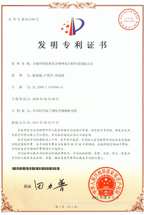 中國(guó)科學(xué)院蘭州化學(xué)物理研究所先進(jìn)潤(rùn)滑與防護(hù)材料研發(fā)中心磨損和表面工程組研發(fā)出含碳纖維的聚苯并咪唑復(fù)合材料制備新方法,該項(xiàng)技術(shù)于近日獲得國(guó)家發(fā)明專利授權(quán)。(含碳纖維的聚苯并咪唑復(fù)合材料的制備方法,專利號(hào):200810150663.6)