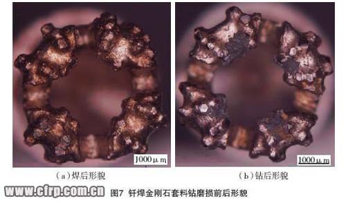 CFRP材料難加工特性之一就是刀具磨損嚴(yán)重,刀具耐用度低。圖6為硬質(zhì)合金麻花鉆磨損前后的形貌圖。從圖中可以明顯看到,硬質(zhì)合金麻花鉆的前刀面出現(xiàn)嚴(yán)重的崩刃和磨損。另外,主切削刃和副切削刃及橫刃都出現(xiàn)不同程度的磨損和崩刃。圖7為釬焊金剛石套料鉆磨損前后的形貌。如圖7(b)所示,鉆頭上的金剛石磨粒均未出現(xiàn)脫落現(xiàn)象,只是鉆頭斷面內(nèi)側(cè)倒角處的釬料被磨掉很多。這是因?yàn)樵囼?yàn)所用釬焊金剛石套料鉆是利用高溫釬焊工藝使金剛石與基體材料實(shí)現(xiàn)結(jié)合的,由于此高溫釬焊技術(shù)實(shí)現(xiàn)了金剛石、釬料和金屬基體界面上的化學(xué)冶金結(jié)合[8], 因此該鉆頭上的金剛石磨粒具有高結(jié)合強(qiáng)度和耐磨性。