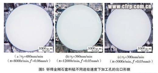 綜上所述,釬焊金剛石套料鉆加工孔的出入口出現(xiàn)撕裂缺陷的臨界進(jìn)給速度比硬質(zhì)合金麻花鉆大。因此,在保證孔質(zhì)量的前提下,釬焊金剛石套料鉆具有更高的加工效率。