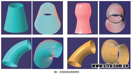 目前,我們提出了一種新的變角度軌跡規(guī)劃算法,可實現(xiàn)錐殼類零件、外殼類零件及變截面接頭類零件的加工制造,如圖3所示。變角度軌跡規(guī)劃算法在上述零件的具體實現(xiàn)中,其最大優(yōu)點是避免了除零件端面外的剪切與重送,可簡化纖維鋪放過程,提高加工效率。同時,改變初始鋪放角,還可以改變零件的固有頻率,對改善整體系統(tǒng)的共振,具有一定的作用。