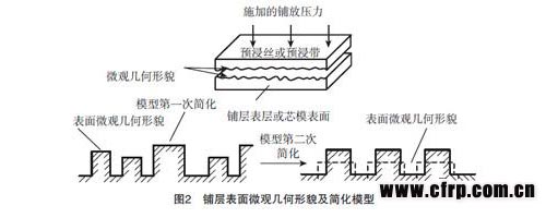 鋪層間緊密接觸度被定義為:在任意給定時間,兩鋪層接觸面積占鋪層面積總面積的百分比,與溫度、壓力、接觸時間有關(guān)[17]。由于表面粗糙度的原因,預(yù)浸絲或預(yù)浸帶表面與鋪層表面(或芯模表面)的微觀幾何形貌為不規(guī)則體,在未加熱和未施加壓力的條件下,預(yù)浸絲或預(yù)浸帶表面與鋪層表面(或芯模表面)不可能完全接觸。為理論計算方便,國外研究人員首先將不規(guī)則的微觀幾何體簡化成大小不同的矩形(指截面),然后再將上述矩形簡化成大小相同的矩形[18-20]。纖維鋪放過程中,在加熱到一定溫度時,當(dāng)壓輥對預(yù)浸絲或預(yù)浸帶施加一定的鋪放壓力后,預(yù)浸絲或預(yù)浸帶與鋪層表面(或芯模表面)的突起的矩形將發(fā)生變形,矩形高度將減小,寬度將增大,然后根據(jù)這一模型,建立計算鋪放壓力與鋪層間緊密接觸度之間的函數(shù)關(guān)系。將現(xiàn)行的粗糙度評價指標(biāo)融入上述計算模型中,可顯著提高實際應(yīng)用的方便程度。圖2為鋪層表面微觀幾何形貌及簡化模型示意圖。