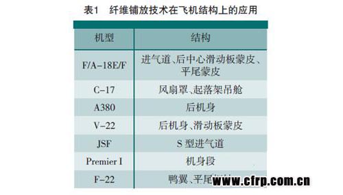 自動纖維鋪放技術(shù)是飛機(jī)復(fù)合材料構(gòu)件自動化成型的關(guān)鍵制造技術(shù)之一,其又可細(xì)分為自動纖維絲鋪放技術(shù)和自動纖維帶鋪放技術(shù)。前者適用于平面型或低曲率的曲面型,或者說準(zhǔn)平面型復(fù)合材料構(gòu)件的鋪層制造;后者綜合了自動纖維纏繞與自動纖維帶鋪放兩者的優(yōu)點,可實現(xiàn)復(fù)雜曲面型復(fù)合材料構(gòu)件的鋪層制造。表1中列出了纖維鋪放技術(shù)在飛機(jī)結(jié)構(gòu)上的應(yīng)用情況[1]。