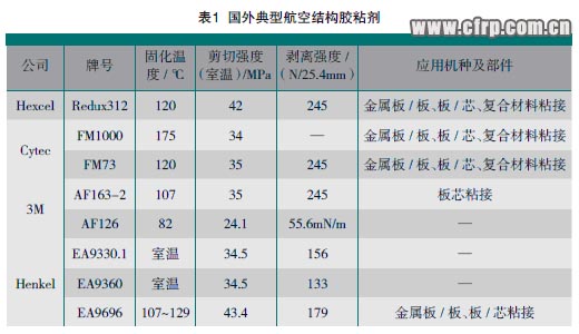 表1、表2分別列出幾種典型國(guó)內(nèi)外復(fù)合材料膠粘劑及其基本性能。