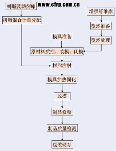 圖10所示為RTM的工藝流程。由于是一種閉模成型工藝,因此RTM的優(yōu)點(diǎn)是:無需膠衣涂層即可使構(gòu)件獲得雙面光滑的表面;在成型過程中散發(fā)的揮發(fā)性物質(zhì)很少,有利于工人的健康和環(huán)境保護(hù);模具制造與材料選擇的機(jī)動(dòng)性強(qiáng),不需要龐大、復(fù)雜的成型設(shè)備就可以制造出復(fù)雜的、有極好制品表面的大型構(gòu)件;根據(jù)設(shè)計(jì)需求,增強(qiáng)材料可以按任意方向鋪放或局部增強(qiáng),因而容易實(shí)現(xiàn)按制品受力狀況鋪放增強(qiáng)材料的目的。成型效率高、投資少以及易實(shí)現(xiàn)自動(dòng)化生產(chǎn)的特點(diǎn),使RTM工藝日益為汽車復(fù)合材料行業(yè)所重視,并逐步成為取代手糊成型、噴射成型的主導(dǎo)成型工藝之一。