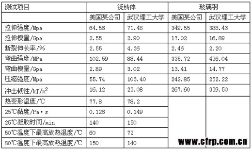 6.2 為改善工藝性,建議采用武漢理工大學(xué)材料學(xué)院復(fù)合材料系研發(fā)的高性能低黏度環(huán)氧樹脂。其已開發(fā)的樹脂玻璃化溫度(Tg)達190℃,黏度可低到80mPa•s,浸漬性大為提高。下面是武漢理工大學(xué)與美國某公司環(huán)氧樹脂實物的測試結(jié)果,可資比較參考。