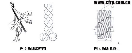 編織是一種古老的織造技術(shù)。編織物(braid)所有的纖維均斜交,與軸線夾角不呈0°與90°。編織原理與編織管如圖3、圖4所示。編織過程腫,纖維的運動軌跡為螺旋線。選擇合理的纖維角度可調(diào)節(jié)成品管材徑向強度與軸向強度的比例;選擇適宜的纖維排列密度可滿足強度與外觀的要求。