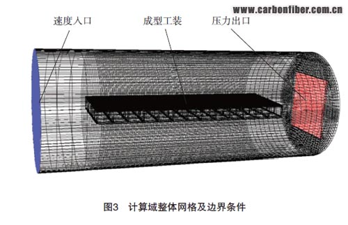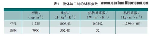 由經(jīng)驗和工藝試驗可知工裝的變形均在毫米量級,工裝的尺寸在幾米至十幾米,工裝結構變形不會對熱壓罐內(nèi)的氣體流動產(chǎn)生明顯影響。由于流體計算對網(wǎng)格要求較高,文中使用專業(yè)流體仿真軟件FLUENT進行工裝及熱壓罐內(nèi)整個流場的網(wǎng)格劃分,如圖3所示。對工裝建立的有限元模型既可以適用于溫度場的計算,也可以用于工裝的結構變形計算。熱壓罐工藝規(guī)范簡化如圖4所示,溫度場計算所用相關材料參數(shù)如表1所示。