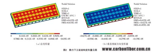 對工裝進行靜力分析,可通過調(diào)節(jié)支撐柱數(shù)量來控制工裝型面變形量大小。為了比較靜力作用下的變形量和熱- 結構耦合作用下的變形量,使用70 個支撐柱。對圖1中工裝進行靜力分析(見圖2),工裝總變形量為0~0.00635mm,垂直型面方向變形量為0~0.00627mm ;靜力作用下,70個支撐柱的工裝結構變形量微小,說明以支撐柱為支撐形式的工裝完全可以滿足靜力作用下的剛度要求。