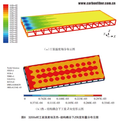 在復合材料的熱壓罐固化過程中,對柱支撐形式的固化工裝型面,溫度不均勻性導致的型面翹曲變形較為復雜。在工裝結構內(nèi)部,支撐柱存在位置所對應型面的局部變形量大于沒有支撐柱存在的位置,這是因為支撐柱對空氣的擾流作用加快了支撐柱與周圍空氣之間的熱傳遞。圖8為3200s時工裝溫度場及Z向結構變形量分布云圖。