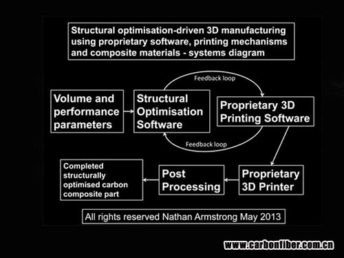 據(jù)Armstrong介紹,他正開發(fā)的技術(shù)采用一種專有工藝,這種工藝采用6軸3D打印機(jī)可以以任意角度打印,并使用最適合這種機(jī)器的熱塑性增強(qiáng)碳纖維長絲,制造最終的連續(xù)纖維結(jié)構(gòu)體。該系統(tǒng)還可以將多個(gè)零件聯(lián)接成一個(gè)更復(fù)雜的部件。此外,額外的打印頭可以同時(shí)進(jìn)行拼接和纖維編織。