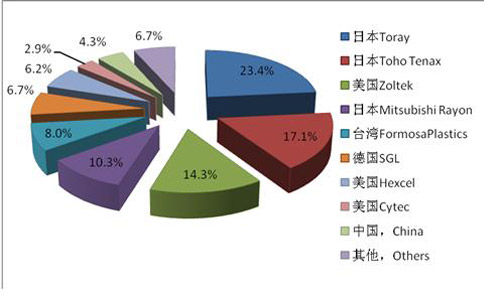 圖:2009年全球碳纖維廠商產(chǎn)能占比(按碳纖維絲束產(chǎn)能計(jì))
